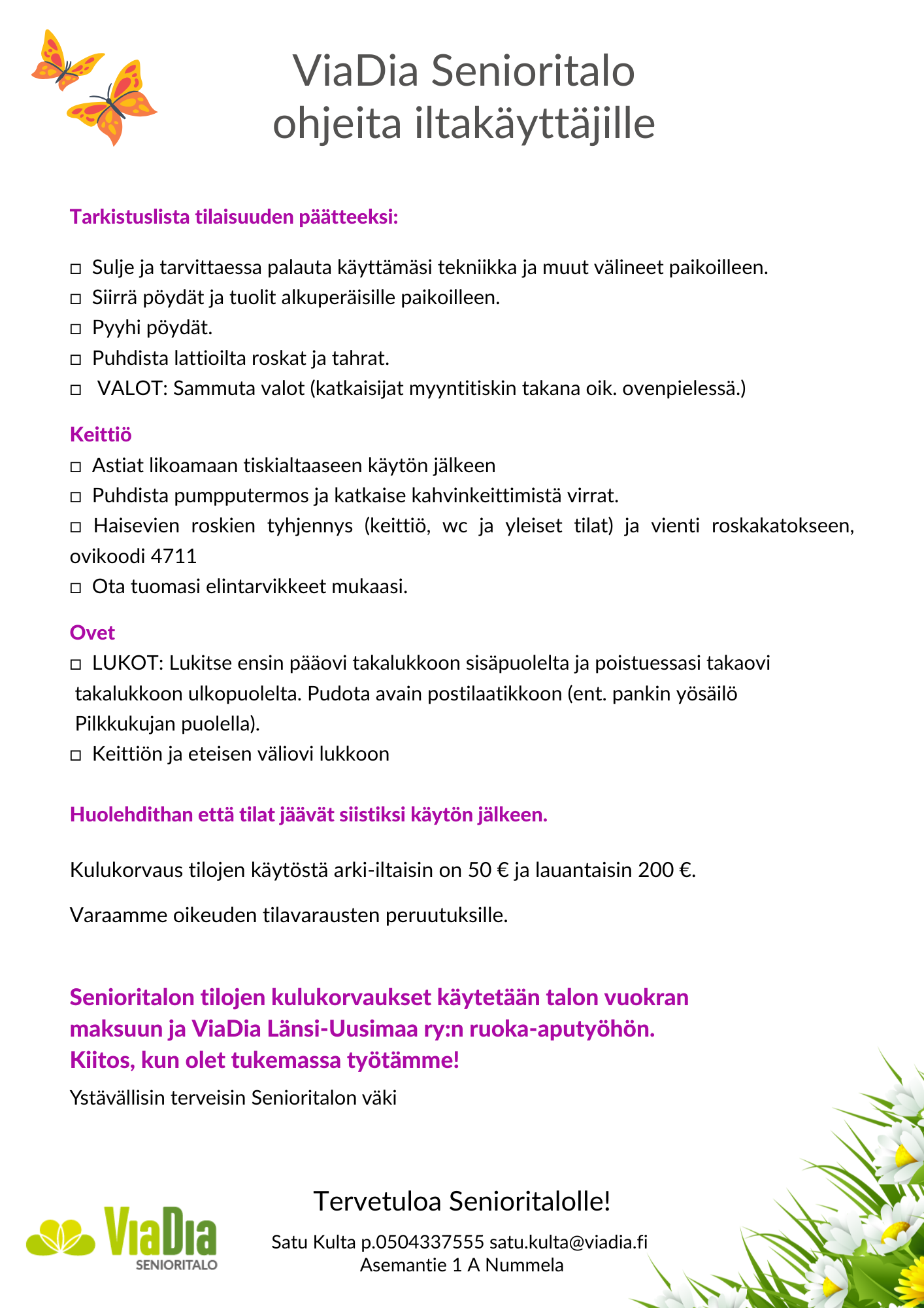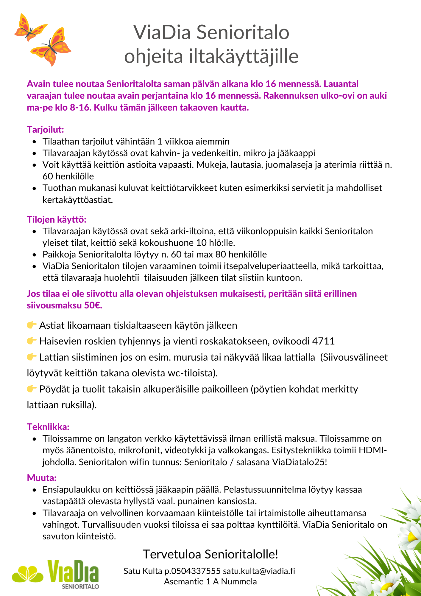 - ViaDia Senioritalon tilojen varaaminen toimii itsepalveluperiaatteella, mikä tarkoittaa, että tilavaraaja huolehtii tilaisuuden jälkeen tilat siistiin kuntoon.
